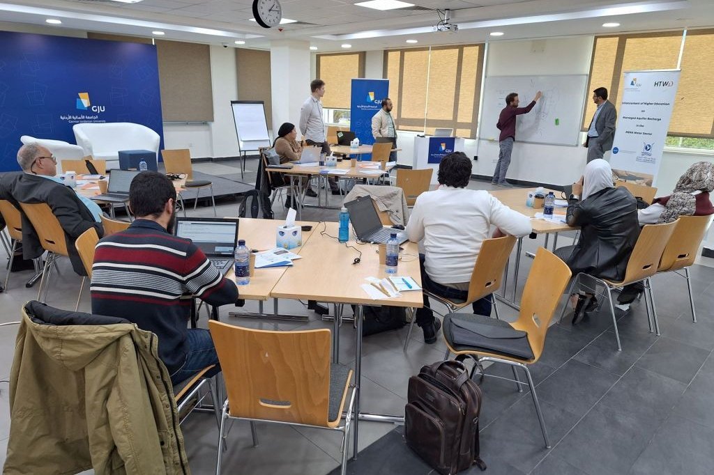 27 people, including 16 Bachelor's and Master's students and doctoral candidates from Jordan, Tunisia and Germany, took part in the ‘Managed Aquifer Recharge Autumn School’ in Amman on 20 and 21 November 2024. The Autumn School was organised by SNREM and HTWD as a further training measure as part of the MENAWAT project. Experts from TUD and UBV (Germany), Yarmouk University (Jordan), the Tunisian Ecole Nationale d'Ingénieurs in Sfax, GJU and HTWD covered topics such as hydraulics, water quality, numerical groundwater modelling, well construction as well as site investigation, monitoring and assessment methods including the application of remote sensing methods.