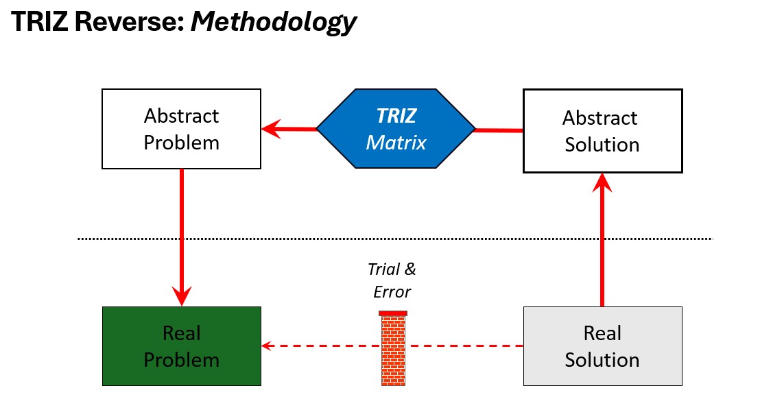 TRIZ (a Russian acronym) or TIPS (Theory of Inventive Problem Solving) is a method recognised in both academia and industry for inventive problem-solving. It involves the systematic resolution of technical contradictions in order to generate innovations. A key element of the TRIZ methodology is the abstraction of the existing problem in order to find innovative solutions. Based on Genrich S. Altschuller’s conflict matrix (1984), there are numerous documented case studies that demonstrate the effectiveness of TRIZ. The approach and methodology for determining the ‘principles of application’ in TRIZ Reverse are based on this classic TRIZ. However, instead of moving ‘from problem to solution’, the reverse path is taken, namely ‘from solution to problem’.