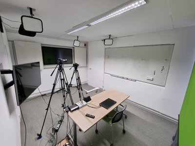 Seit Mitte Juni 2021 gibt es an der Fakultät Informatik/Mathematik einen Raum, der für Videoaufzeichnungen konzipiert und aufgebaut wurde. Das Raumkonzept besteht dabei aus zwei angrenzenden Räume: Der eine Raum bietet zwei Arbeitsplätze. Einer fungiert dabei als Regieplatz und der andere als Schnittplatz. Der zweite Raum ist der Hauptaufzeichungsraum. Der Aufzeichnungsraum ist einem kleinen Studio nachempfunden. Aufgrund von diversen LED-Panels ist eine gute und gleichbleibende Beleuchtung gegeben. So können zu jeder Jahres- und Tageszeit mit den zwei vorhandenen Kameras perfekt ausgeleuchtete Videos aufgenommen werden. Außerdem bietet die Live-Vorschau auf dem Fernseher die Möglichkeit das Videobild zu kontrollieren.