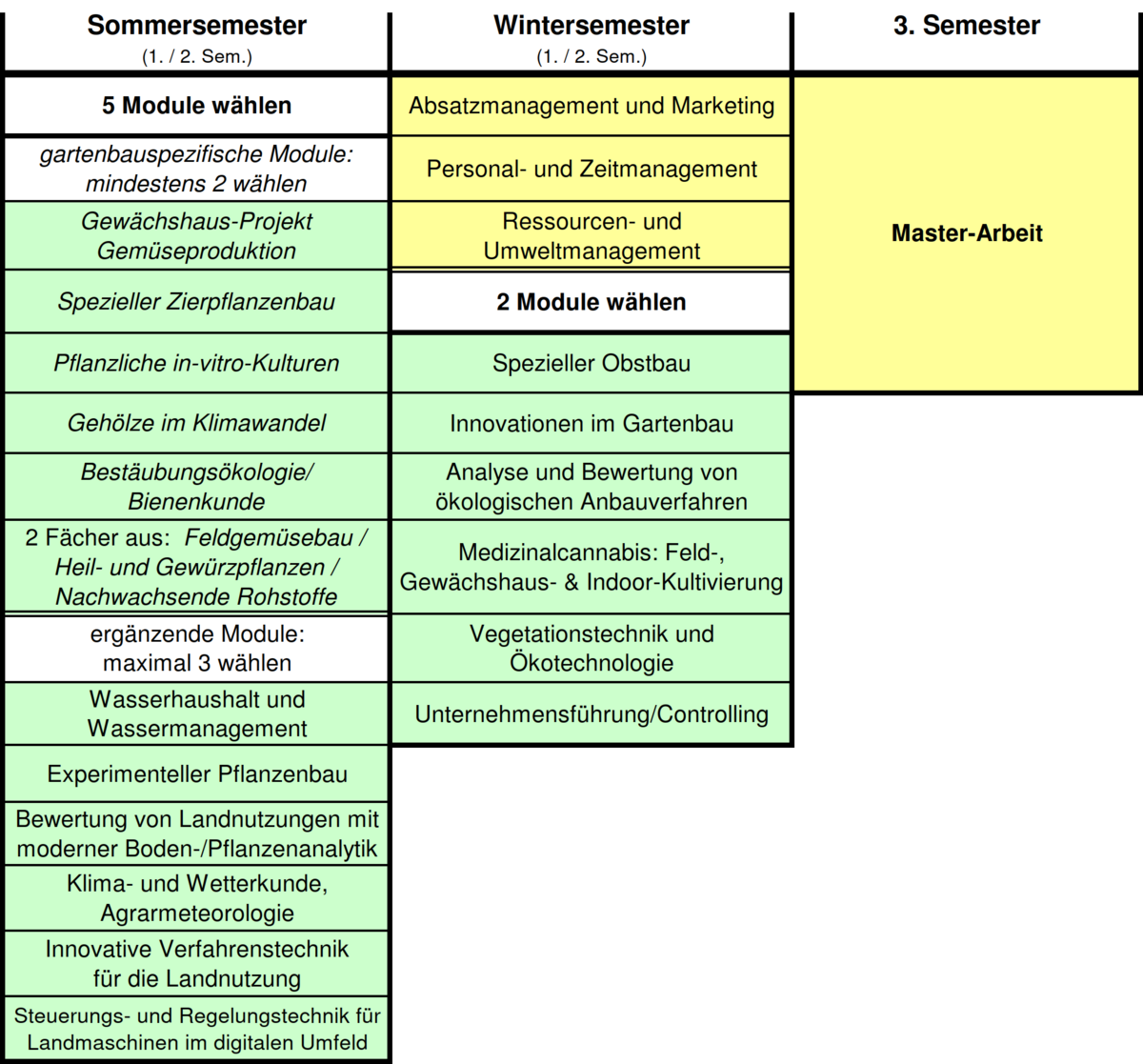In den ersten beiden Semestern des Master-Studiums werden Kompetenzen zum Management sowie zu spezifischen Produktionsverfahren und angewandter Forschung im Gartenbau vermittelt.