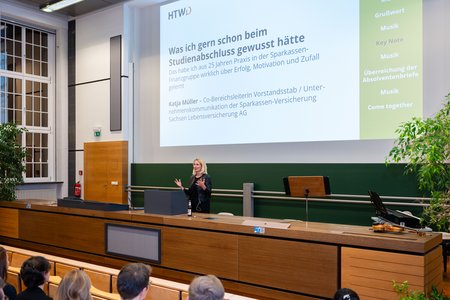 Ein besonderes Highlight bot die Keynote von Katja Müller, Co-Bereichsleiterin Vorstandsstab / Unternehmenskommunikation der Sparkassen-Versicherung Sachsen Lebensversicherung AG. In ihrem Vortrag mit dem Titel „Was ich gern schon beim Studienabschluss gewusst hätte“ gab Sie Impulse und Praxistipps für den Berufseinstieg mit und zeigte anhand ihres bisherigen Werdegangs die berufliche Vielfältigkeit im wirtschaftswissenschaftlichen Bereich auf.