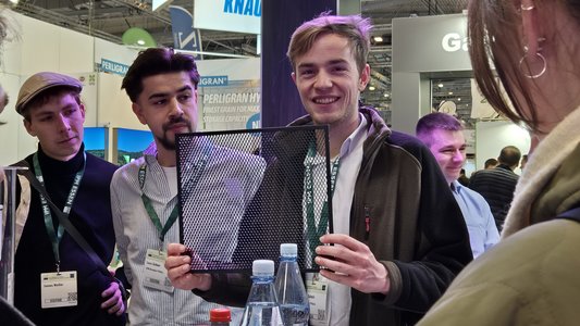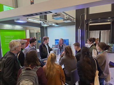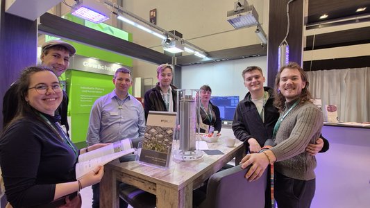 Zum Glück setzt die Mehrheit der Firmen auf der Messe nicht auf bloße Augenwischerei, sondern tatsächliche Innovationen und Verbesserungen. Ein gutes Beispiel bekamen die Studierenden am Stand der Firma DH Licht vorgeführt. Da bereits im Vorjahr dort ein Firmengespräch für die Exkursionsteilnehmer stattgefunden hatte, war mancher unsicher, ob es bei der Fülle an anderen Möglichkeiten nicht Zeitverschwendung sei, erneut mitzukommen. War es nicht. Diesmal vom Gründer und Geschäftsführer persönlich empfangen und über Geschichte und Werdegang informiert – inklusive der tröstlichen Erkenntnis, dass nicht jeder erfolgreiche Unternehmer bereits als Kind seine Berufung findet – blieb besonders eine simple und doch wertvolle Neuerung in Erinnerung: ein Blendschutz für Gewächshauslampen in Schauanlagen. Um die Augen des Publikums zu schonen und auf das Wesentliche zu lenken, lässt sich ein eigens entwickeltes Loch-Raster vor die Lampe schieben und das Licht fällt nur dorthin, wo es soll – auf die Pflanzen. Kosten: unter 20 Euro, Wirkung: enorm.