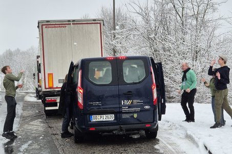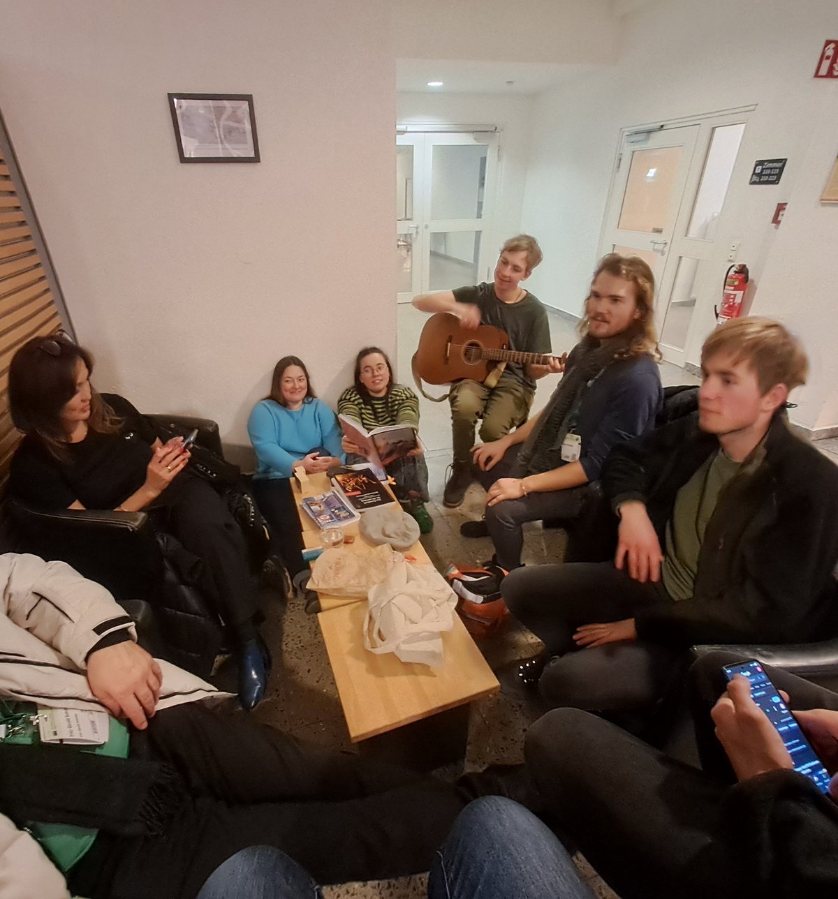 Dass bei der dreitägigen Exkursion auch diesmal der Spaß nicht zu kurz kam, versteht sich von selbst: Von der Schneeballschlacht am Autobahnrastplatz bis zum „Stimmbandtraining“ gab es wieder reichlich Gelegenheit, gemeinsame Momente zu erleben. Anders als letztes Jahr stand das Gemeinschaftszimmer mit Klavier der Jugendherberge leider nicht zur Verfügung – aber Jannes Weißer, 7. Semester und kurz vor dem Bachelorabschluss, hatte vorgesorgt und seine Gitarre mitgebracht. Und so versammelte sich die Gruppe dann am späteren Abend im Rezeptionsbereich und stimmte inbrünstig und querbeet ein Lied nach dem anderen an.