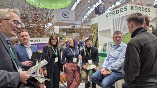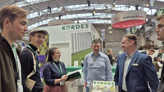 Wie berechtigt sein Stolz ist, und weshalb sich der Besuch der IPM für die Studierenden lohnt, demonstrierte eindrucksvoll eines der für die Gruppe arrangierten Messegespräche. Letztes Jahr selbst noch studentischer Teilnehmer, hieß Philipp Heidel-Weizel nun am Stand von Kordes Jungpflanzen seine ehemaligen Kommilitoninnen und Kommilitonen willkommen. Damals stand er kurz vor Abschluss des Masterstudiums, wurde unerwartet auf der Messe von dem Traditionsunternehmen mit europaweit bekanntem Namen angeworben. Diesmal nun präsentierte er nicht nur die Firma allgemein, sondern auch Insider-Erkenntnisse – Wissen, das kein Studium, sondern nur gelebte Erfahrung in der Branche vermitteln kann.