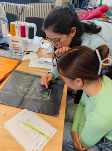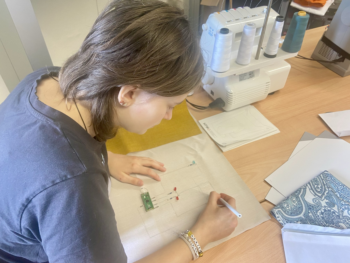 Dabei haben wir gemeinsam gelernt, dass es gar nicht so einfach ist, ein passendes Design zu entwickeln und dieses mit der LED-Technologie zu verbinden. Leitfähiges Garn musste vernäht, der Micro-Controller und die LEDs an den richtigen Stellen festgenäht und dann mit dem Garn auch noch richtig angeschlossen werden. Eine zusätzliche Herausforderung war dabei alles so sauber zu vernähen, dass das leitfähige Garn sich nicht überkreuzt! War all diese Arbeit getan - kam der große Augenblick: Technik-Test mit Robert Ringel! Immer wieder konnte man ein begeistertes "Juchu! Es leuchtet!" hören!