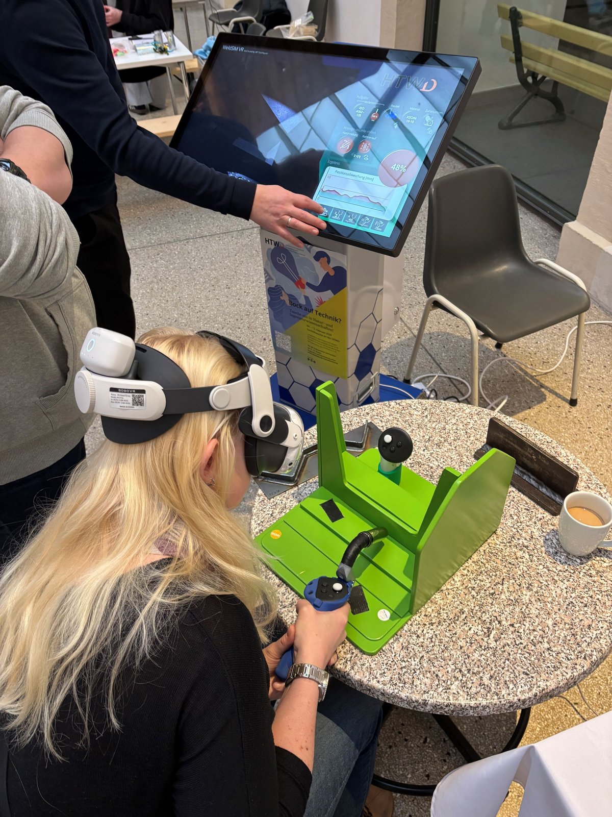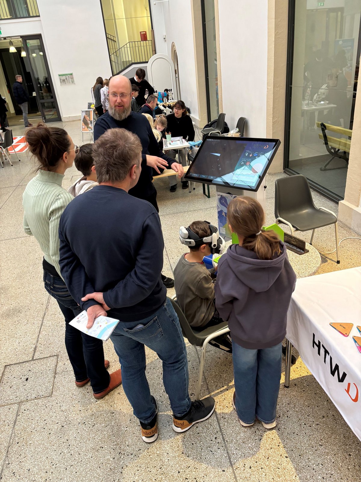 Am Stand der HTW Dresden bekamen Besucherinnen und Besucher Einblicke in VR-Anwendungen und konnten virtuelles Schweißen ausprobieren. Der Stand war ganztägig gut besucht und sowohl Kinder als auch deren Eltern staunten über das VR-Erlebnis. Neben der praktischen Erfahrung bot sich auch die Gelegenheit, über weitere Angebote und Formate der HTWD für Schülerinnen und Schüler ins Gespräch zu kommen und sich zu einem Studium an der HTWD zu informieren.