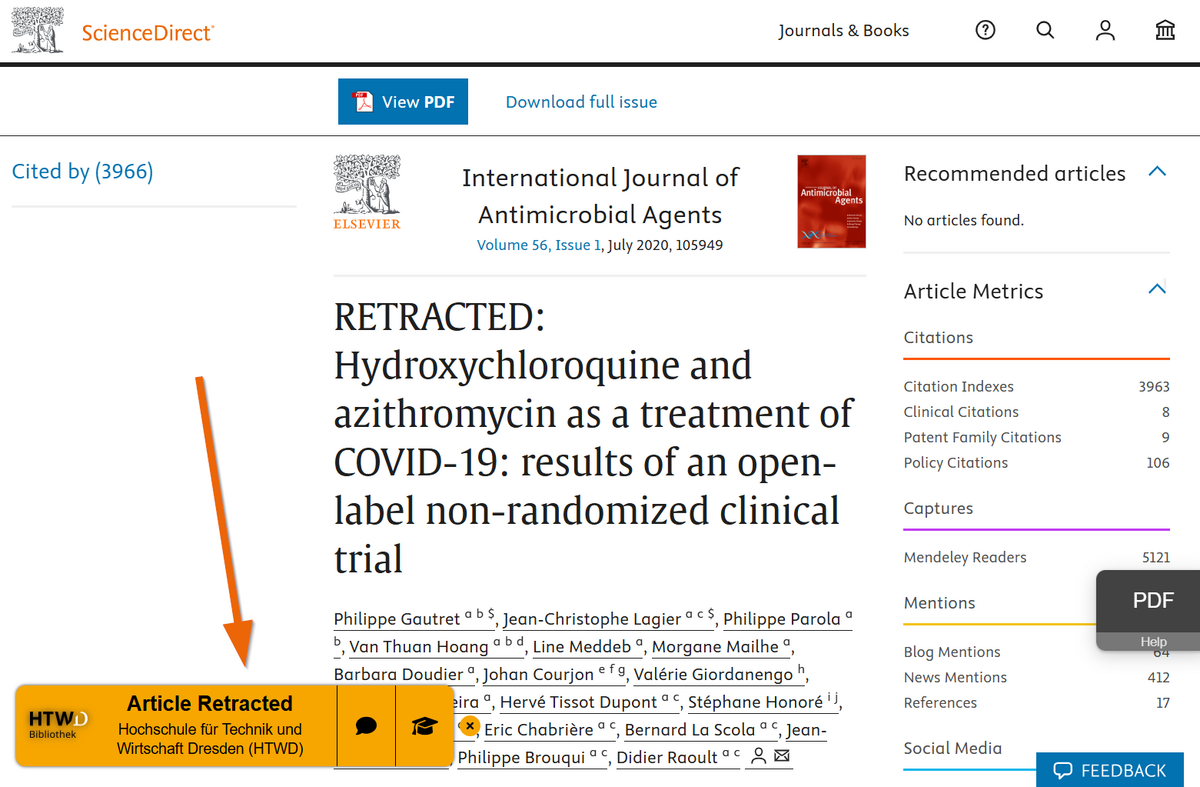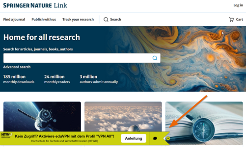 Installieren Sie die Browsererweiterung, wählen Sie die HTWD als Ihre Organisation aus und vermeiden Sie ab sofort fehlerhafte Links, Paywalls und umständliche Zwischenseiten! Gehen Sie stattdessen den direkten Weg aus dem Web zu den von Ihrer HTWD Bibliothek lizenzierten Inhalten und Open Access-Veröffentlichungen!