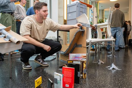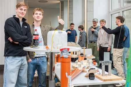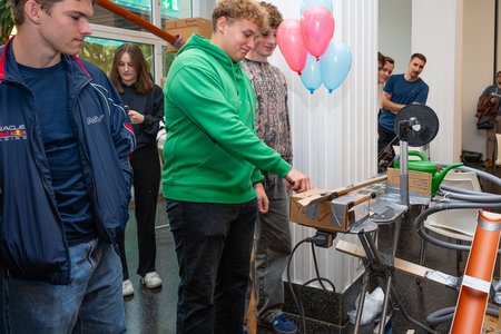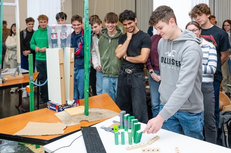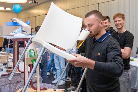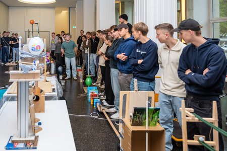 Turbulent ging es am Freitag, den 10.10.2025, im PAB zu: Als Abschluss ihrer Startwoche präsentierten 85 Studienanfängerinnen und -anfänger des Studiengangs Wirtschaftsingenieurwesen ihre Goldbergmaschinen: Aufgabe war es – gemäß des amerikanischen Karikaturisten Rube Goldberg – eine Maschine zu konstruieren, die so kompliziert wie möglich ein Glas Bier einschenkt. Das Projekt basiert auf einer Installation von Peter Fischli und David Weiß aus den 1980er Jahren „Der Lauf der Dinge“.