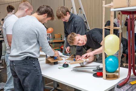 In zwanzig kleinen Teams wurden Abschnitt für Abschnitt vier aufwändige Konstruktionen errichtet: Verbaut wurden unter anderem Mausefallen, HotDogs, Trockeneis oder Spielzeugautos, Leitern, Bohrmaschinen oder Garderobenständer. Unter Anleitung von Studiendekan Dr. Andreas Heinen entstanden in enger Kooperation mit dem LabX und der großartigen Unterstützung von dessen technischen Betreuer Georg Kluge und Robert Haack von der Gründungsschmiede wahre Meisterwerke.