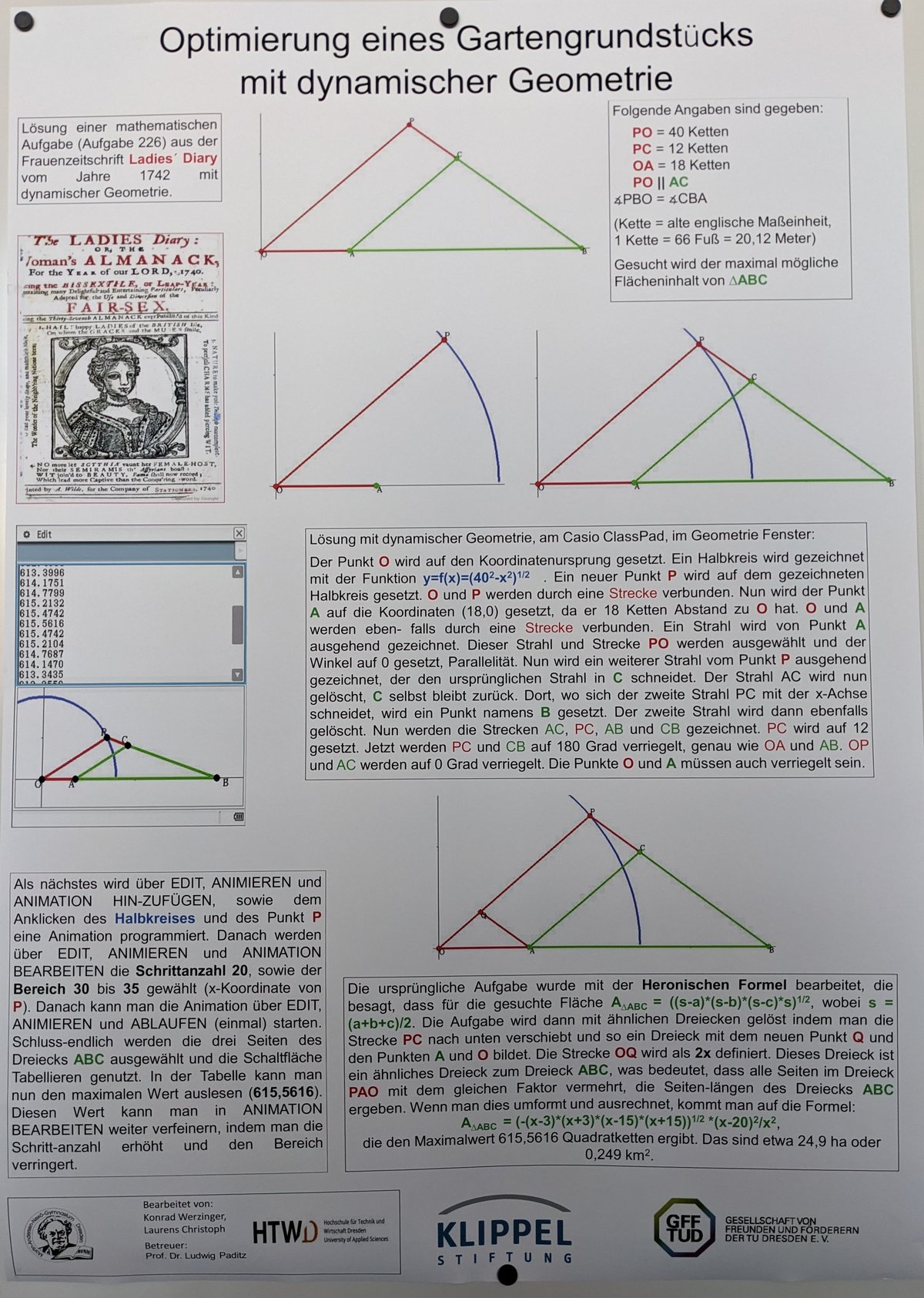 Zunächst wurde der historische Text mithilfe von ChatGPT übersetzt, um inhaltliche Klarheit zu gewinnen. Anschließend erfolgte die Lösung mithilfe dynamischer Geometrie (ClassPad II), durch Tabellierung der Zielfunktion sowie ergänzend durch eine analytische Betrachtung. Dabei setzten sich die Teilnehmenden auch mit historischen Längen- und Flächenmaßen auseinander.