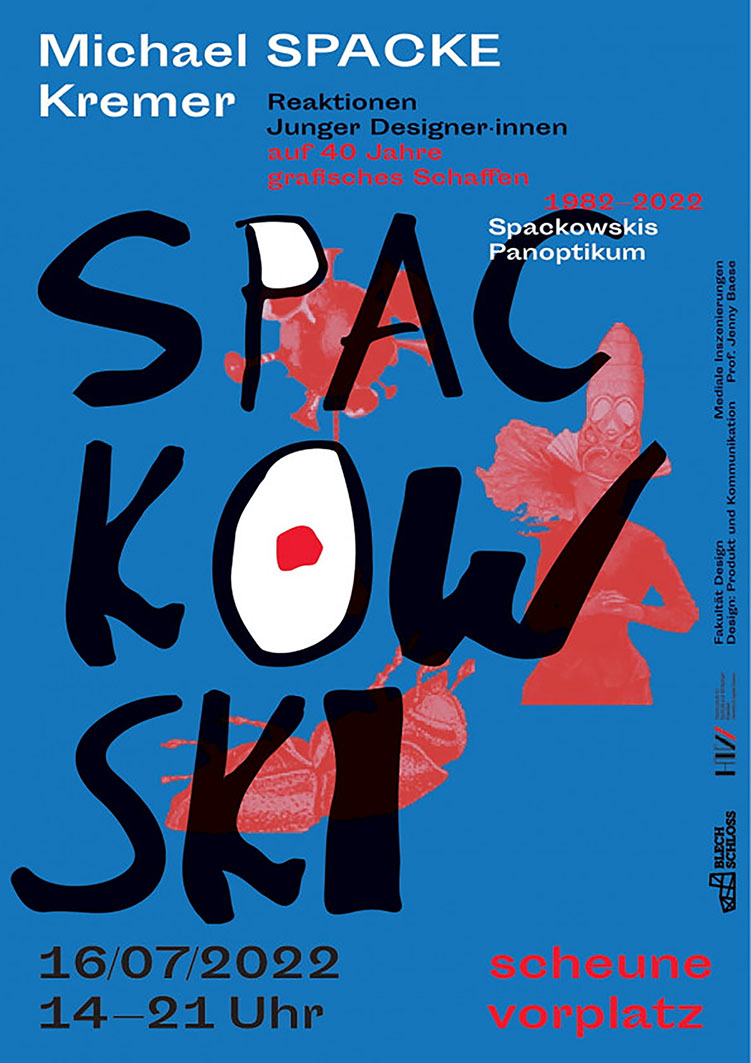 Als Abschluss des Seminars laden die jungen Gestalterinnen und Gestalter ein, sich ins Spacke-Universum abholen zu lassen, um gemeinsam mit ihnen in die Welt des Neustädter Grafikers einzutauchen: am Samstag, den 16.07.2022 ab 14 Uhr auf dem Vorplatz der Scheune und im Blechschloss. Die Ausstellung wurde gemeinsam mit den Studierenden von Professorin Jenny Baese kuratiert und mit Unterstützung der Scheune realisiert.