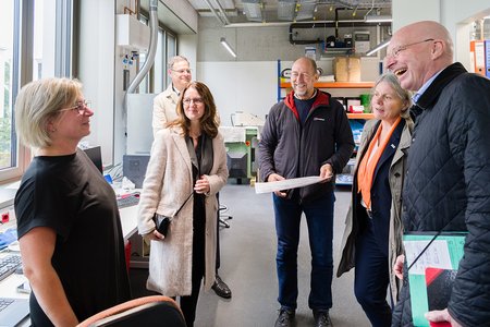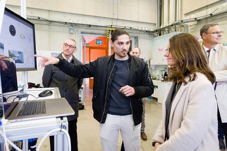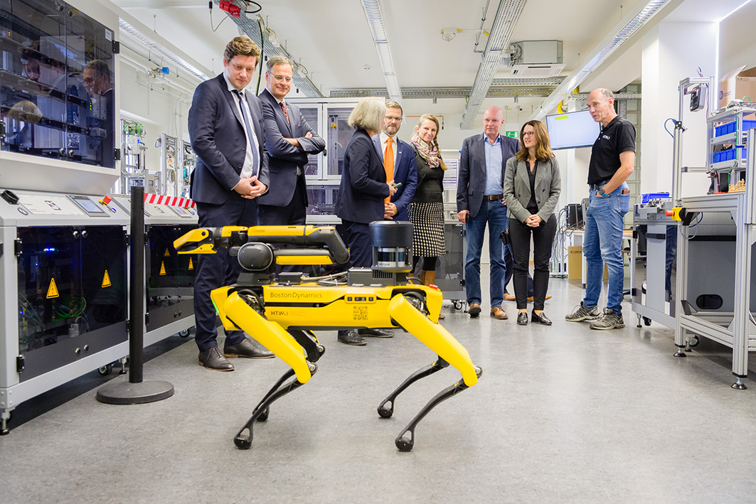 Im Anschluss informierte sich die Staatssekretärin bei einem Rundgang über zentrale Forschungsfelder der Hochschule. Vorgestellt wurden unter anderem: Robotik in der Modellfabrik Industrie 4.0., Nachhaltiges Bauen in den Laboren der Fakultät Bauingenieurwesen, das Forschungsgebiet Gesundheit an der Fakultät Design sowie das Testfeld Autonomes Fahren.