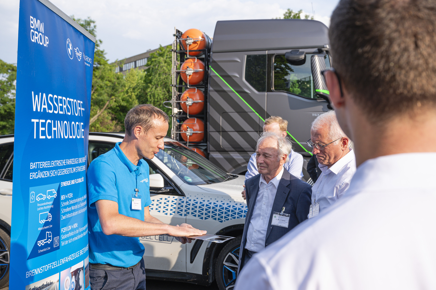 Unser besonderer Dank geht an die beiden Fahrzeugaussteller MAN Truck&Bus SE und BMW Group für die hervorragende Präsentation der Exponate, ein Nutzfahrzeug mit H2-Verbrennungsmotor und ein Pkw mit Brennstoffzellenantrieb, und anregende Einblicke in die Welt der Wasserstofftechnologien.