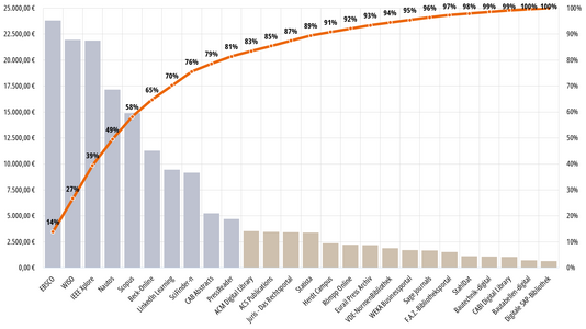Im Folgenden finden Sie für jede Datenbank die Kosten pro Download bzw. Vollansicht für die vollen Kalenderjahre seit 2022, für die uns die entsprechenden Daten vorliegen. Zur besseren Vergleichbarkeit haben wir die Angaben mithilfe eines Ampelsystems gekennzeichnet, das die Nachfrage der einzelnen Produkte wie folgt unterteilt: