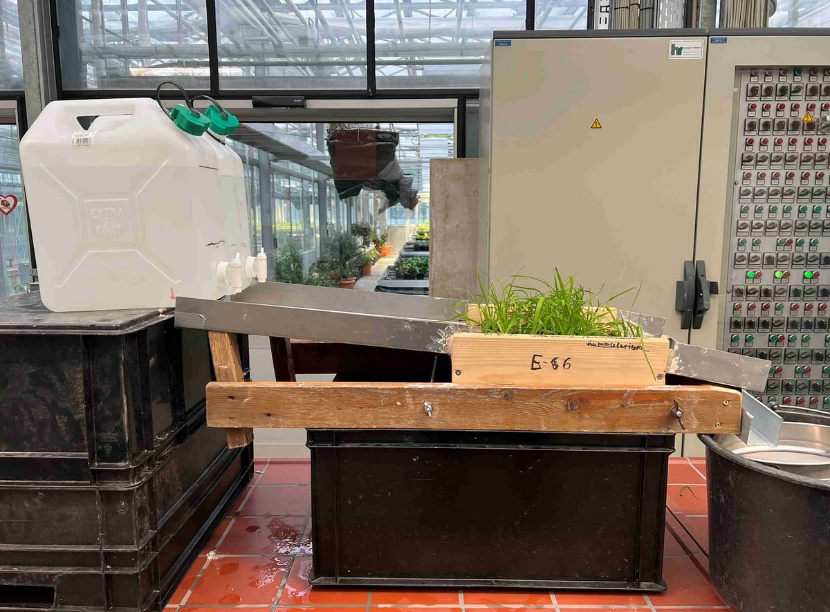 Zur experimentellen Untersuchung wurden tragbare, mit Substrat gefüllte und bepflanzte Retentionsmodule entwickelt. Diese werden in einer Versuchsapparatur definiert mit Wasser und Plastikpartikeln überspült.